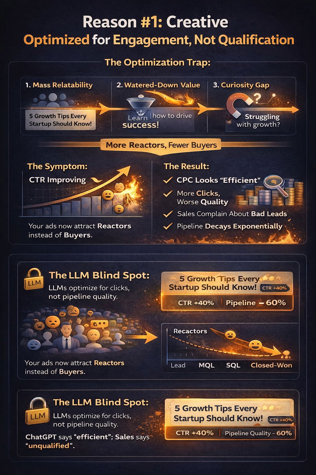 Until you have that intelligence, optimizing for CTR is a coin flip: you might get lucky, or you might systematically destroy your pipeline while your engagement metrics look phenomenal.